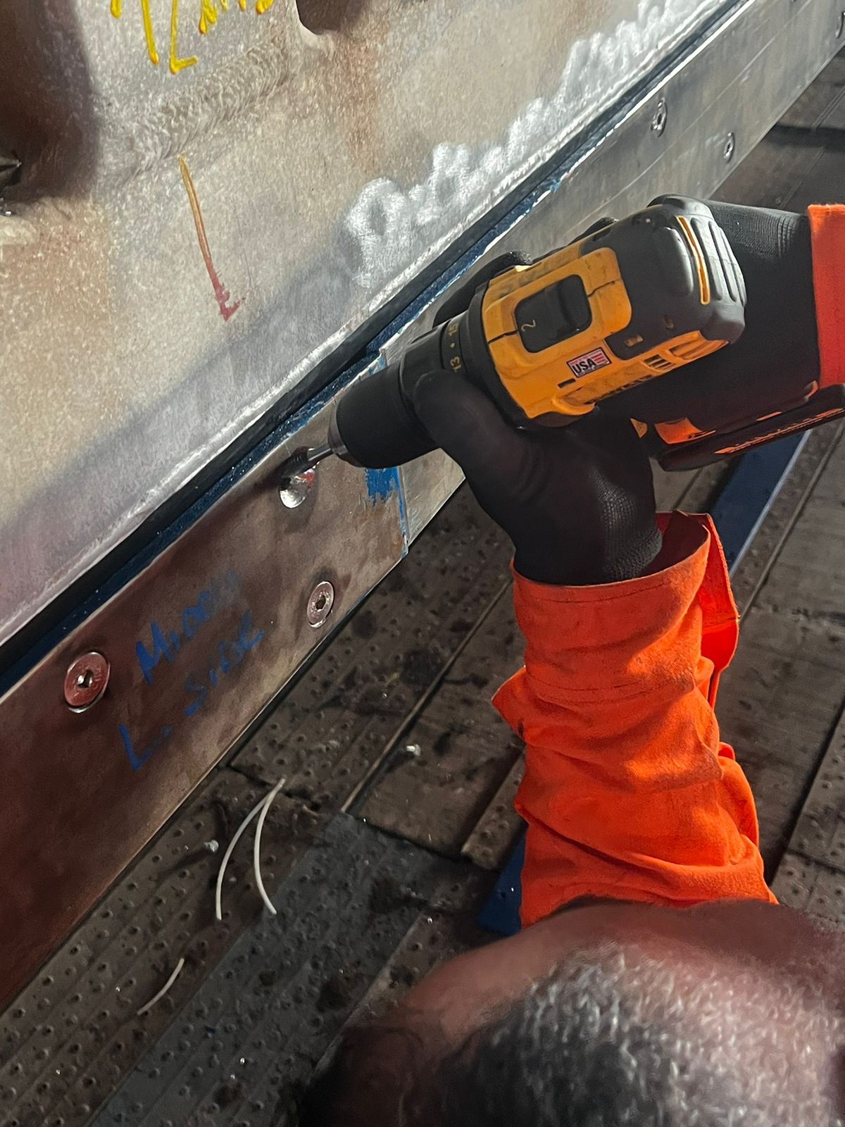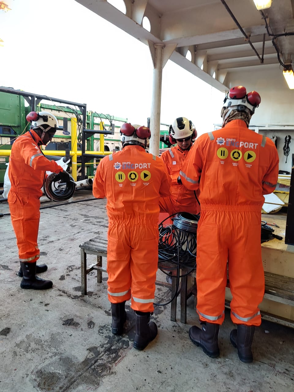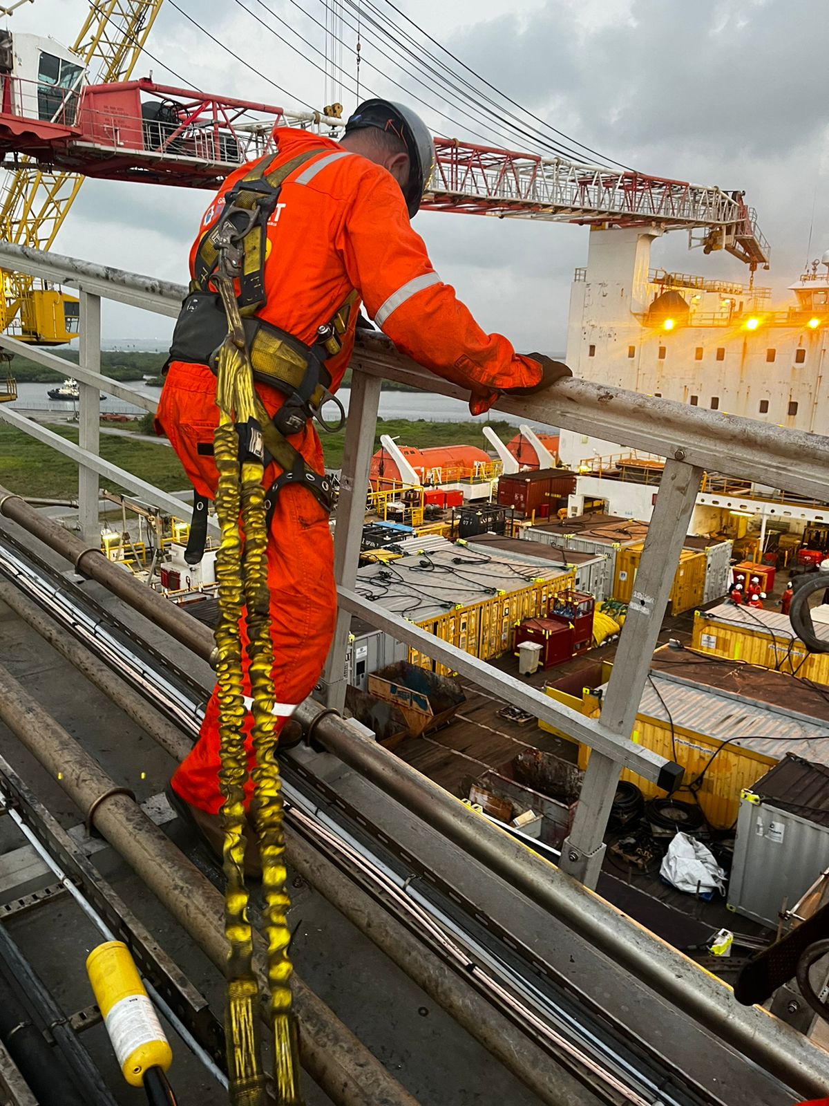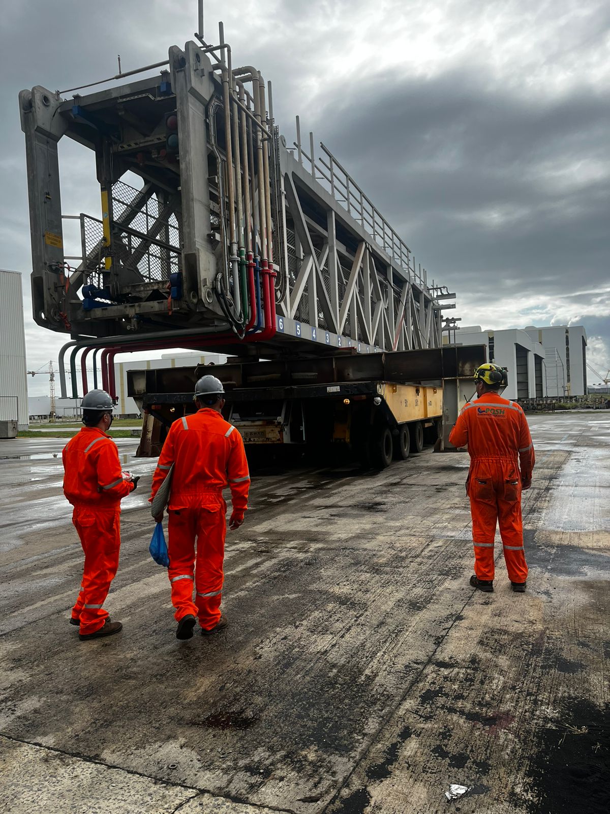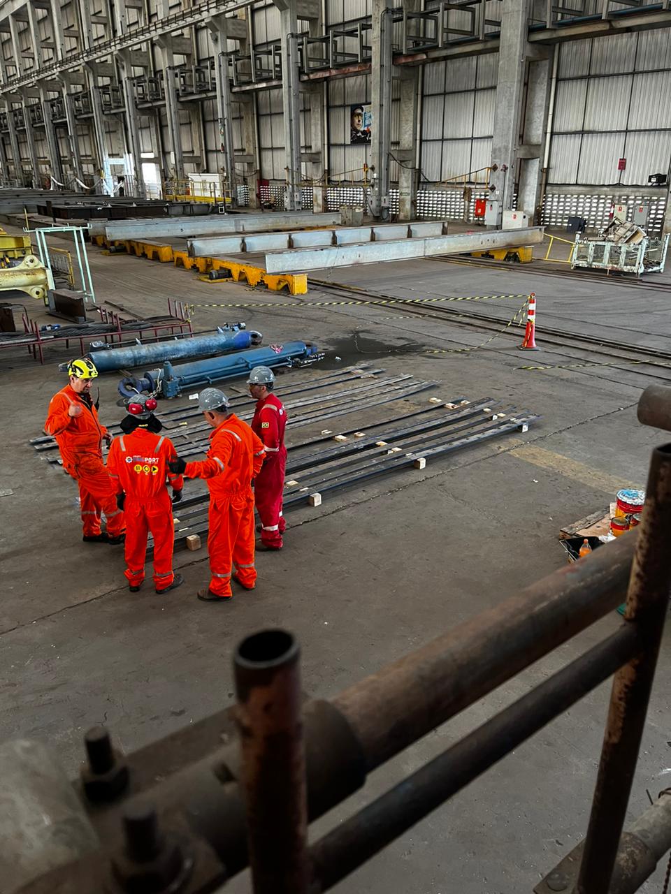 O escopo central era a manutenção em componentes da gangway (passarela de embarque/desembarque) – sistema crítico de segurança. Nossa equipe executou desmontagem e montagem da parte estrutural da passarela.